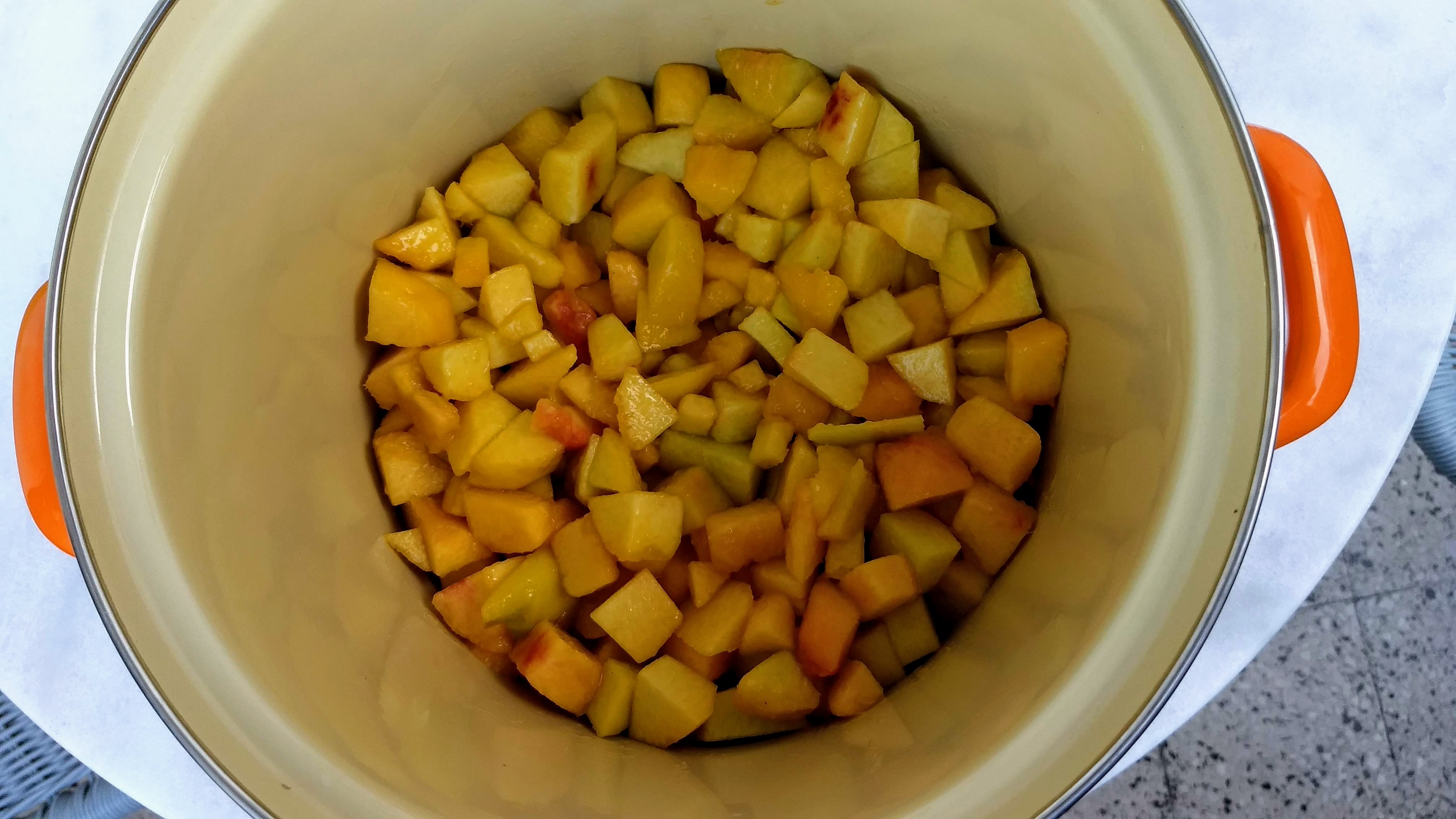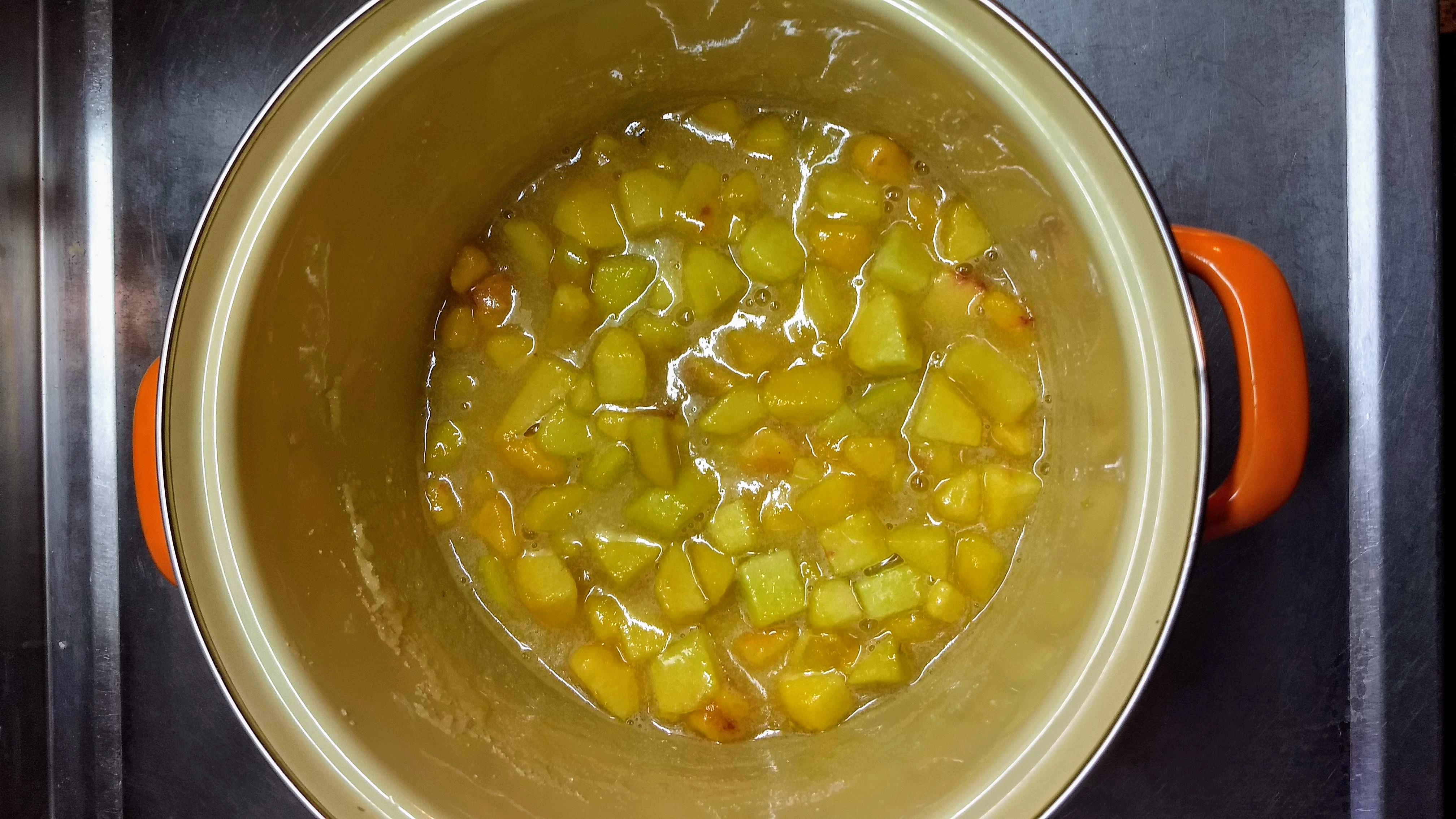 - Meter los trozos de durazano en una olla. Agregar el azúcar y el limón. Mezclar
