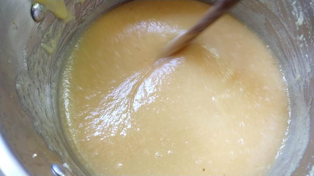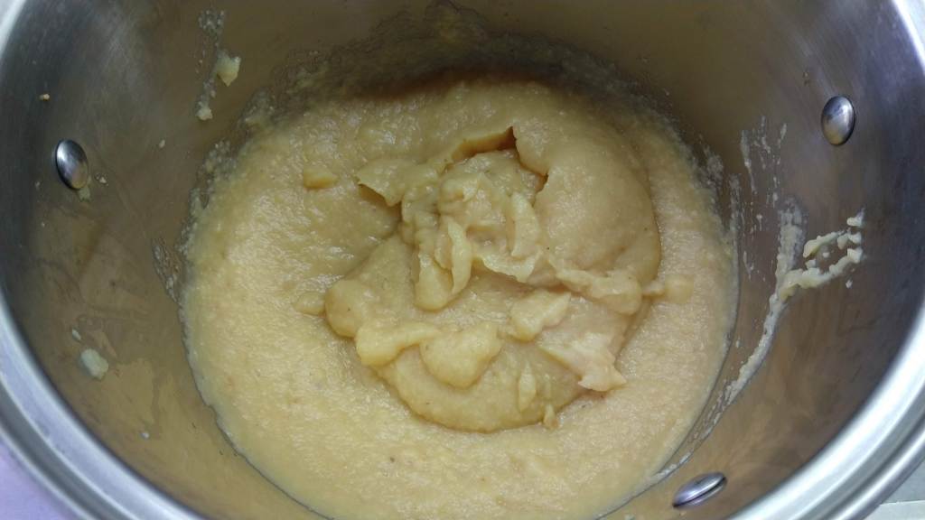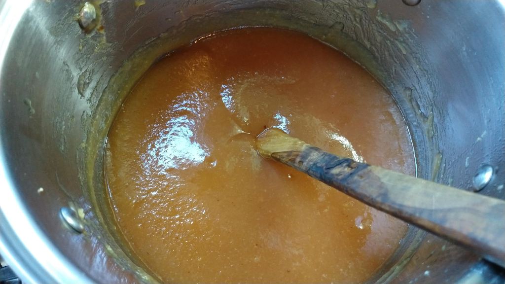 - Cocinar durante al menos 45 minutos, revolviendo constantemente. El puré va tomando color y se espesa. Cuando se despega fácilmente de las paredes de la olla apagar el fuego