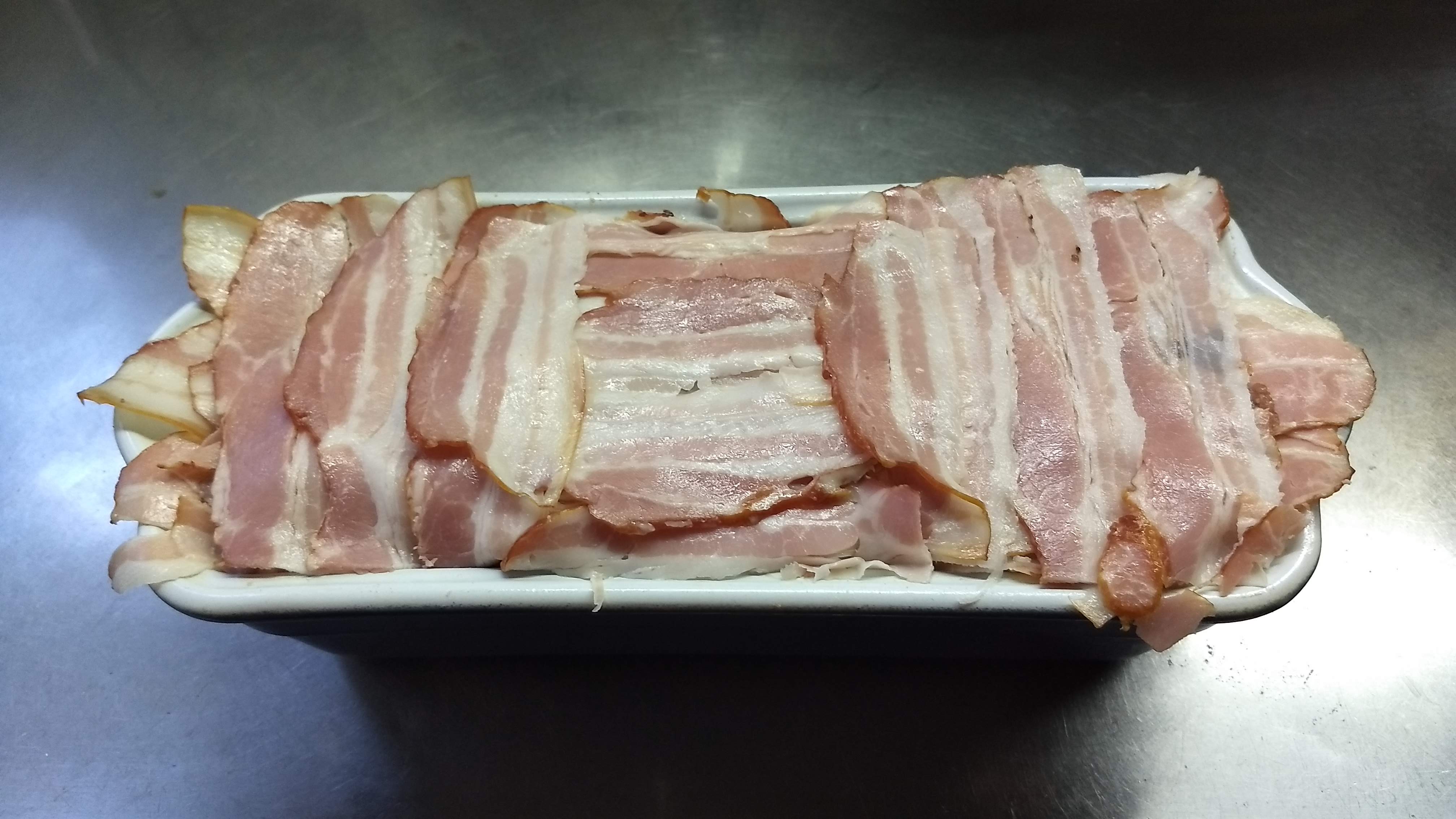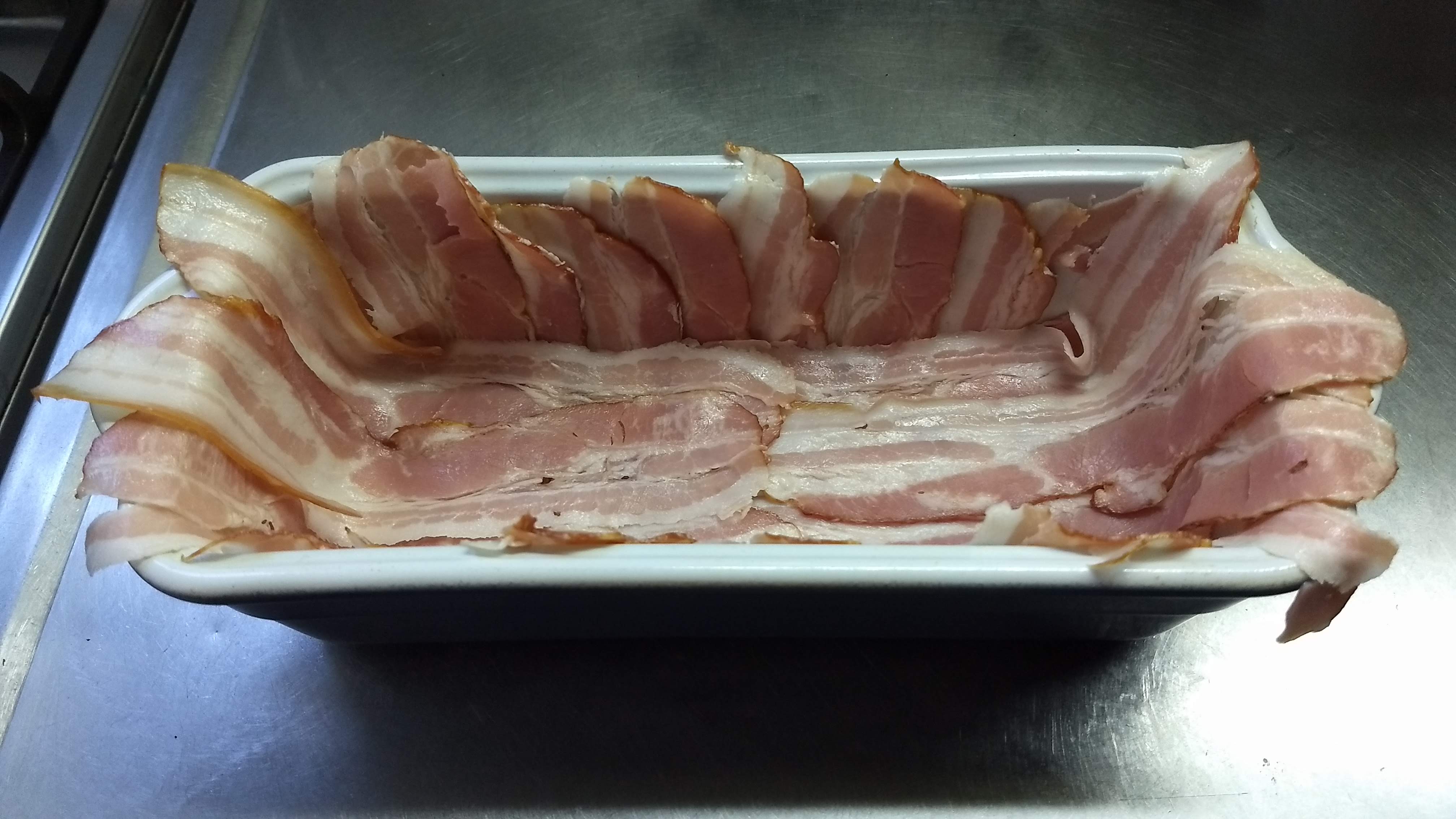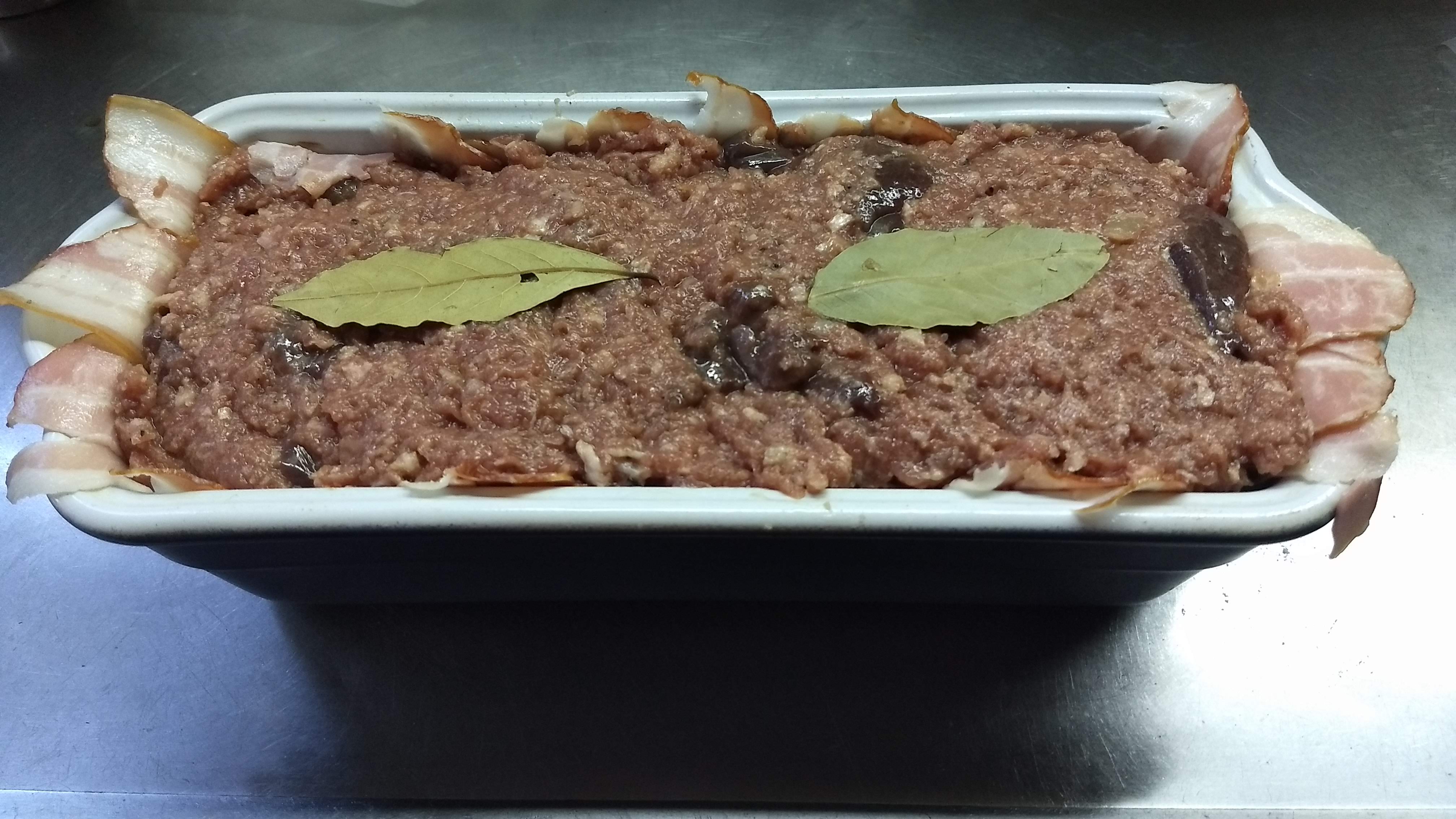 Molde: cubrirlo con panceta en fetas o grasa. Rellenar con la preparación. Poner dos hojas de laurel y tapar con panceta. Recubrir el molde con aluminio.