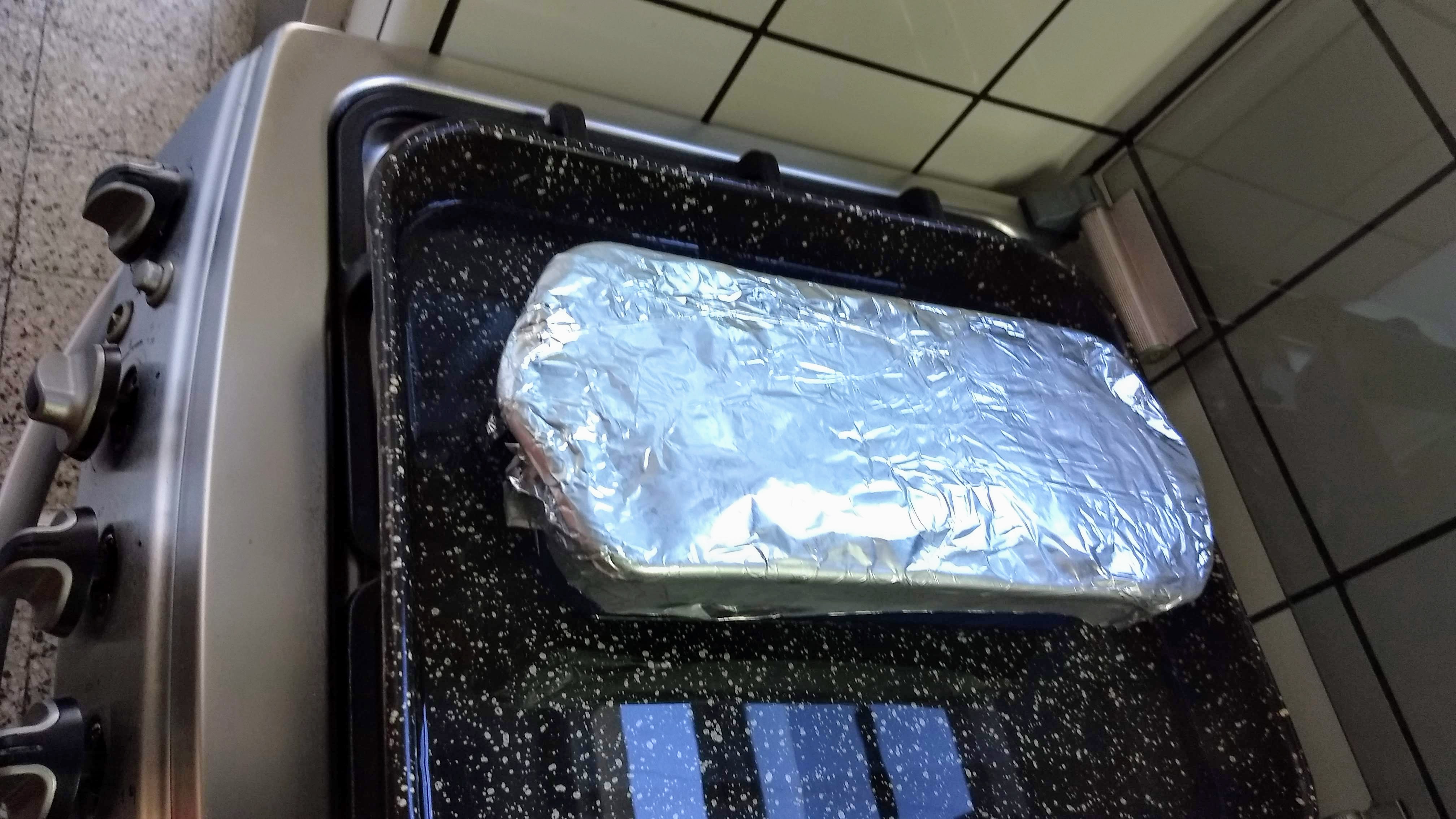 Poner el molde en una asadera y agregarle agua hirviendo (tipo baño maría) hasta 1/2 o 2/3 de la altura del molde.