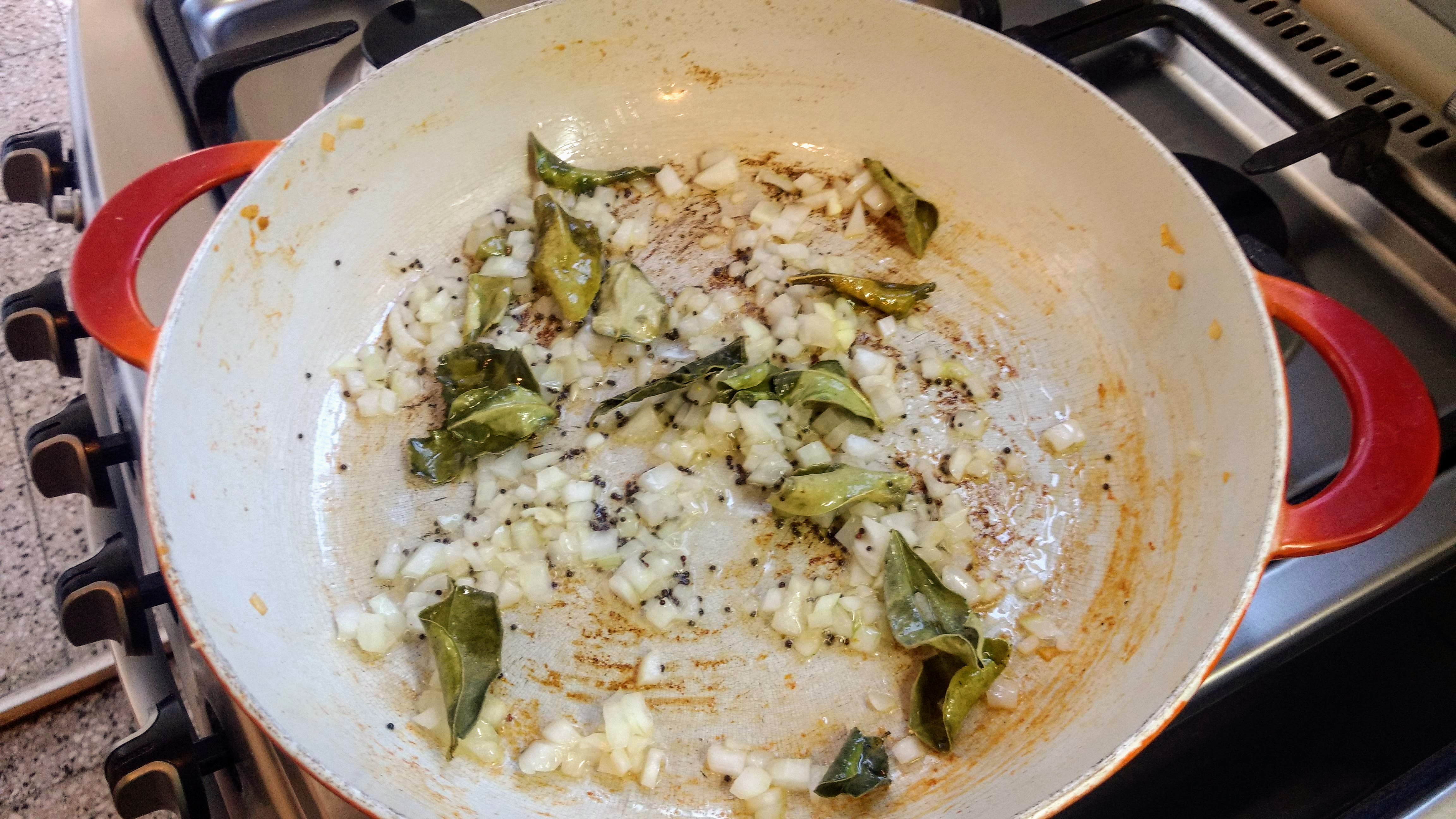 - En el momento que las semillas comiencen a explotar tipo pochoclo agregar las hojas de kaffir y ½ taza de cebollas