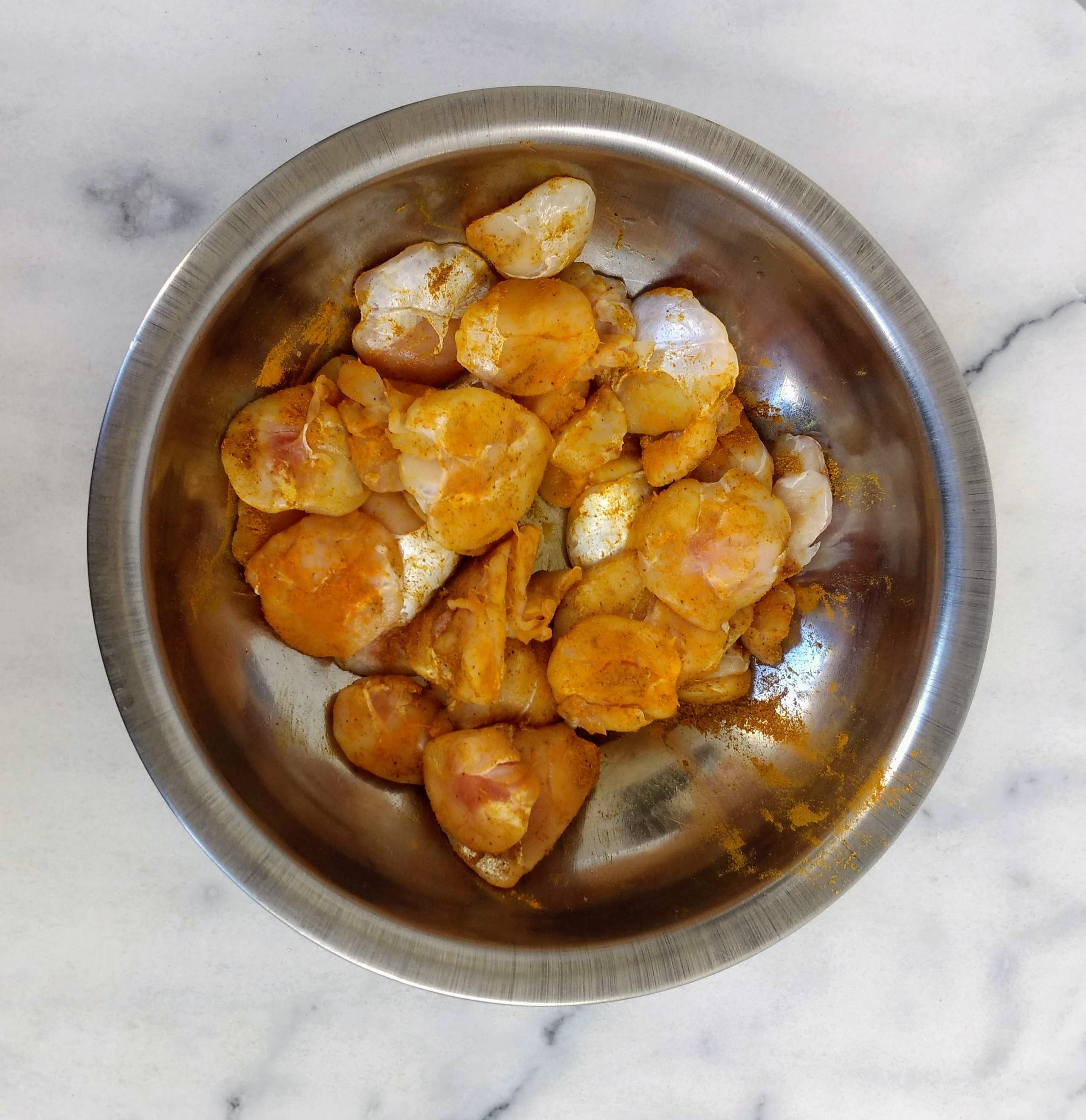 - Poner a marinar en la heladera el pescado mezclado con la cúrcuma, tapar con papel film mientras se prepara el resto