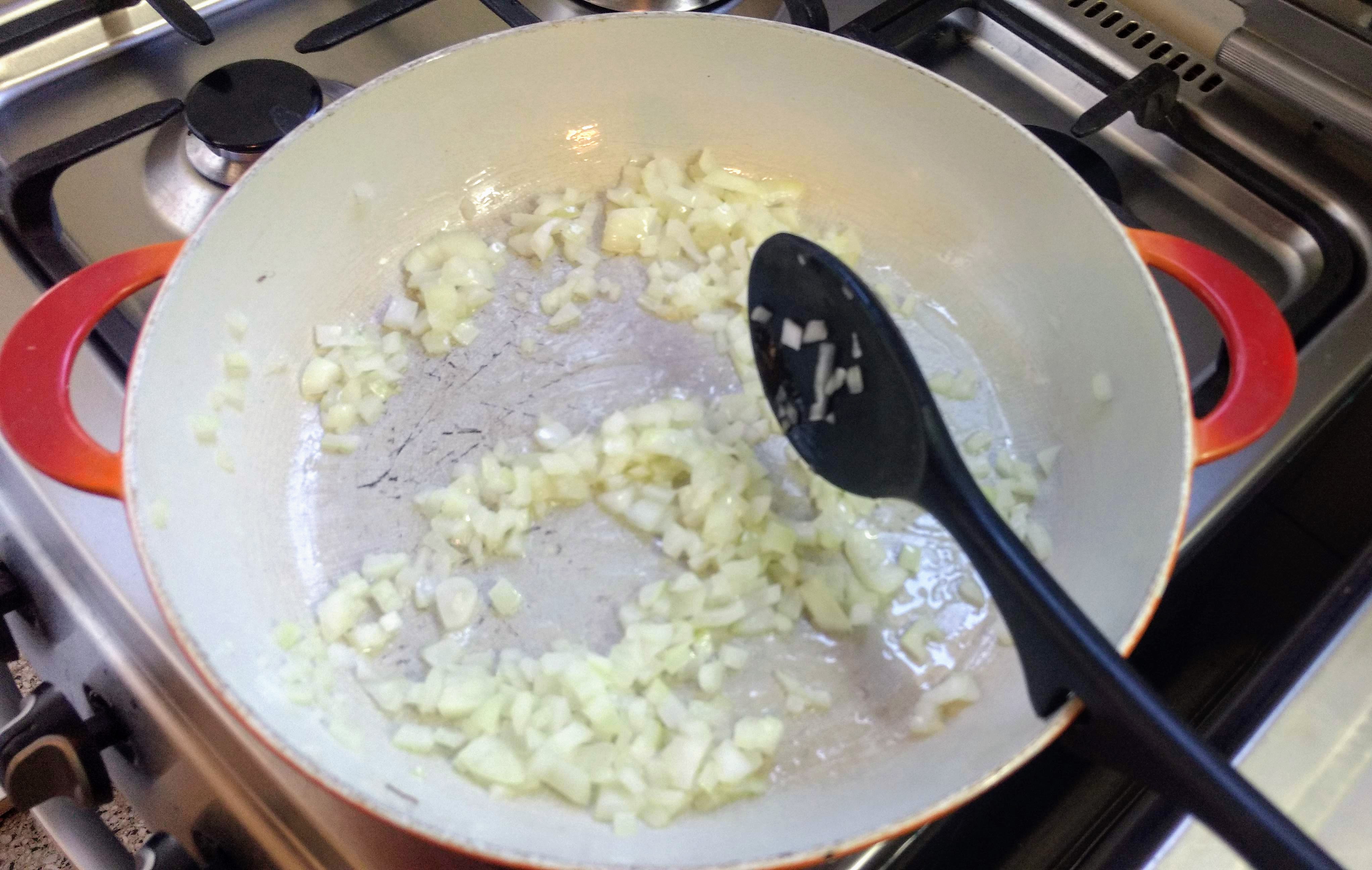 - En una olla baja calentar un poco de aceite y cocinar ½ taza de cebolla cortada en cubos (reservar el resto)