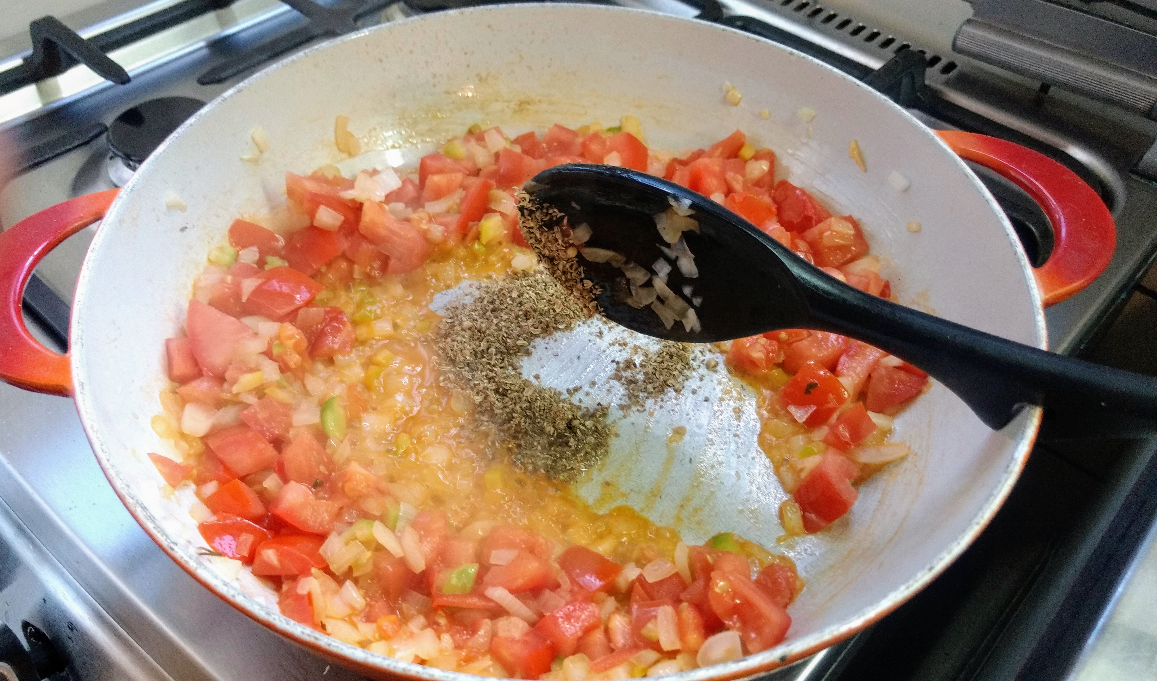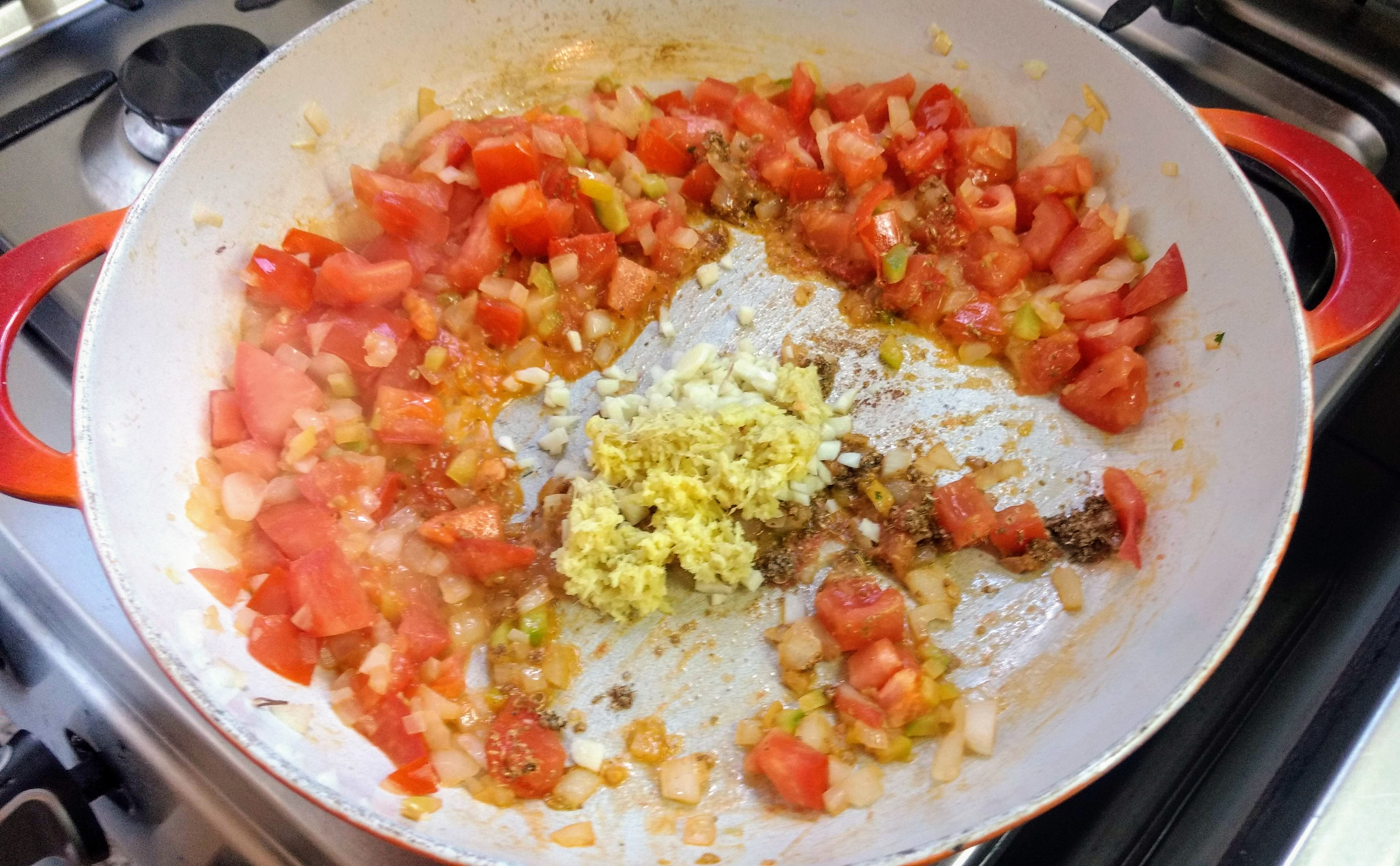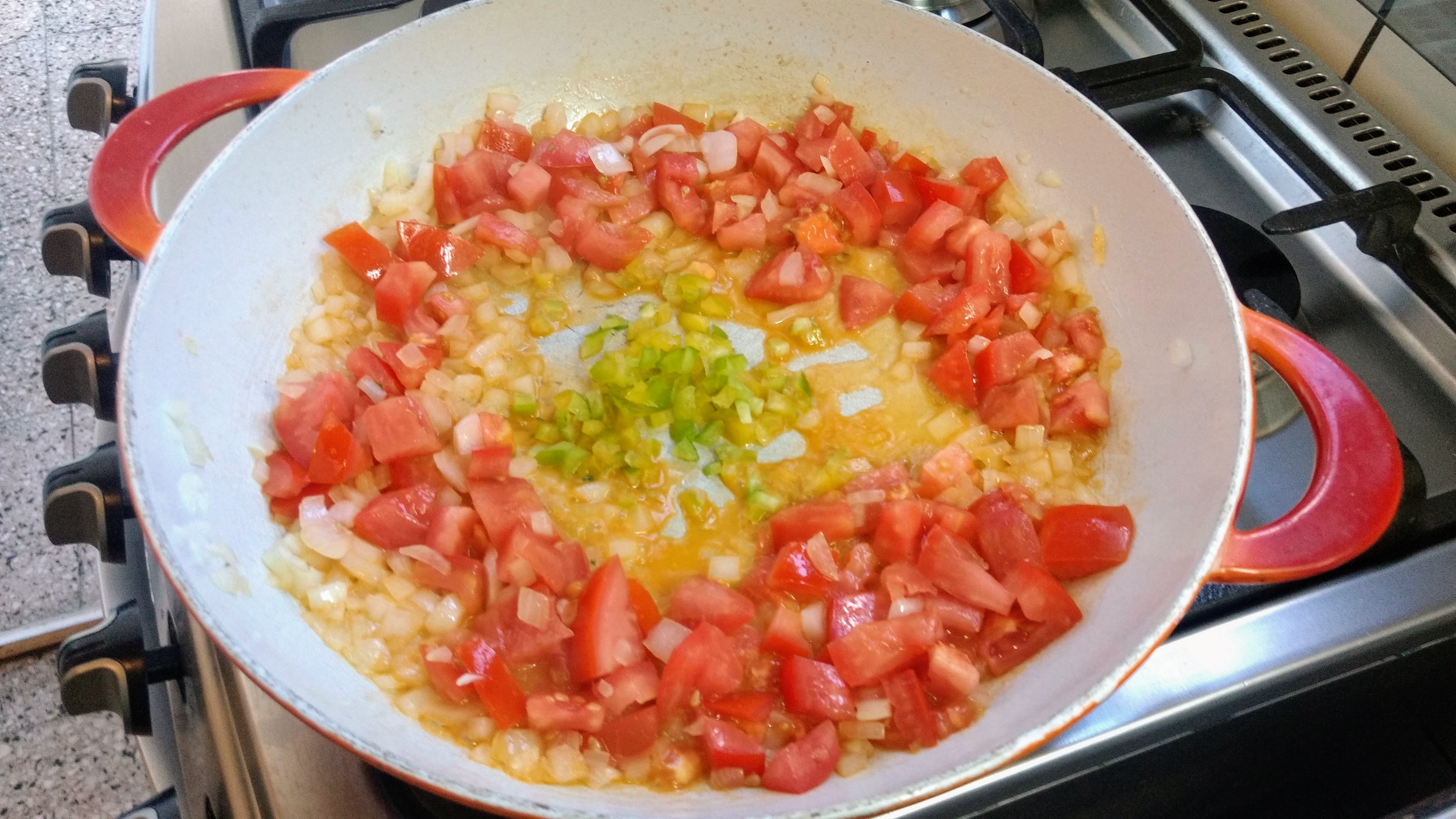 - Una vez que está blanda (que no se dore) agregar el tomate y el chili o ají fresco. Cocinar unos 5 min