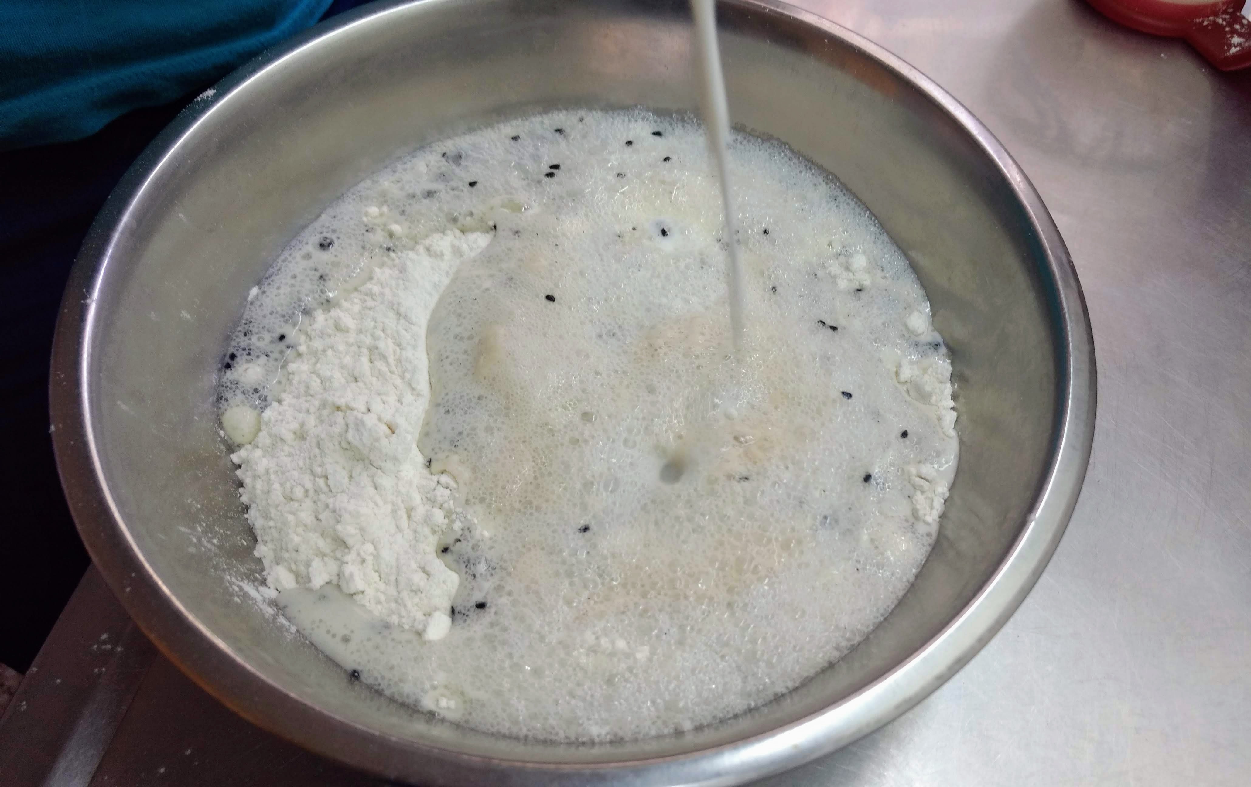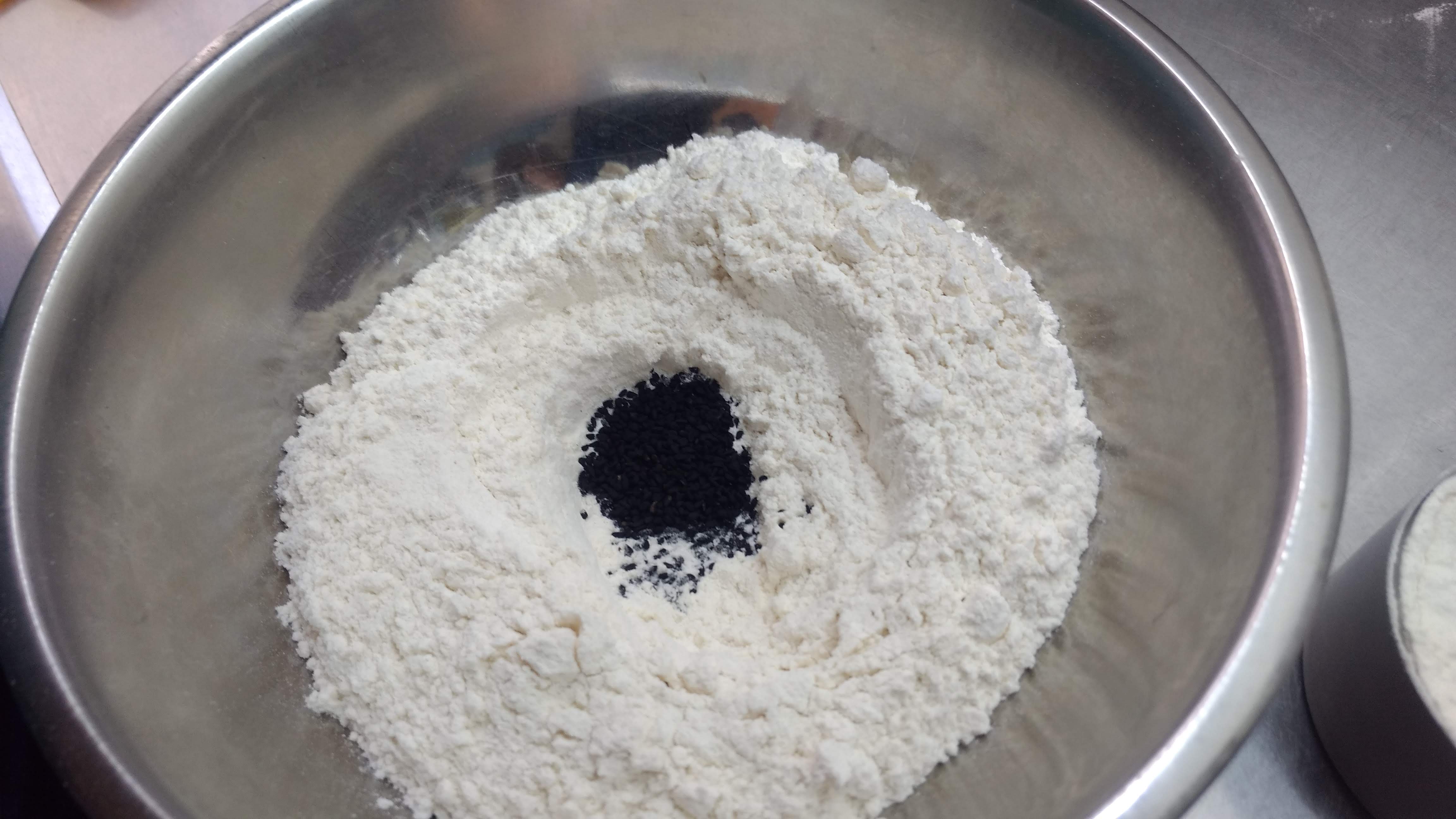 - Poner 2 ½ tazas de harina (reservar ½ taza) en un bol junto a las semillas de nigella