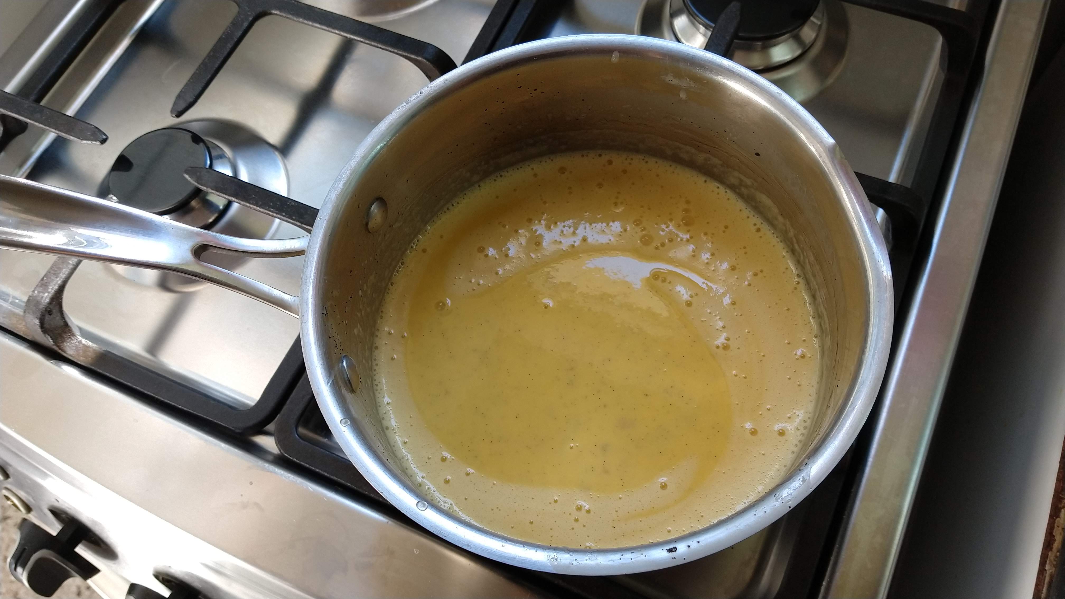 Cuando la crema hierve, verterla sobre la mezcla de yemas y azúcar batiendo constantemente.