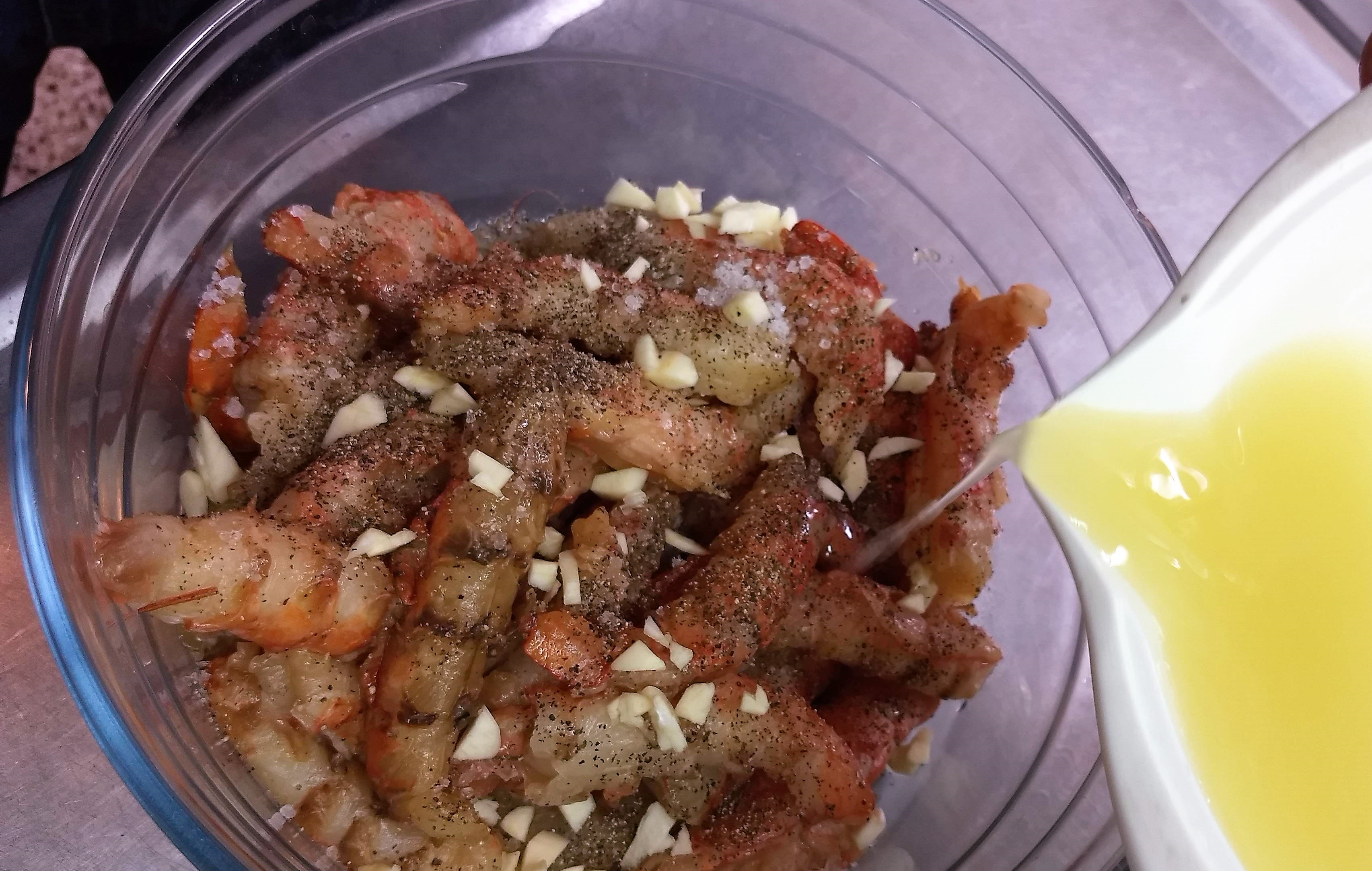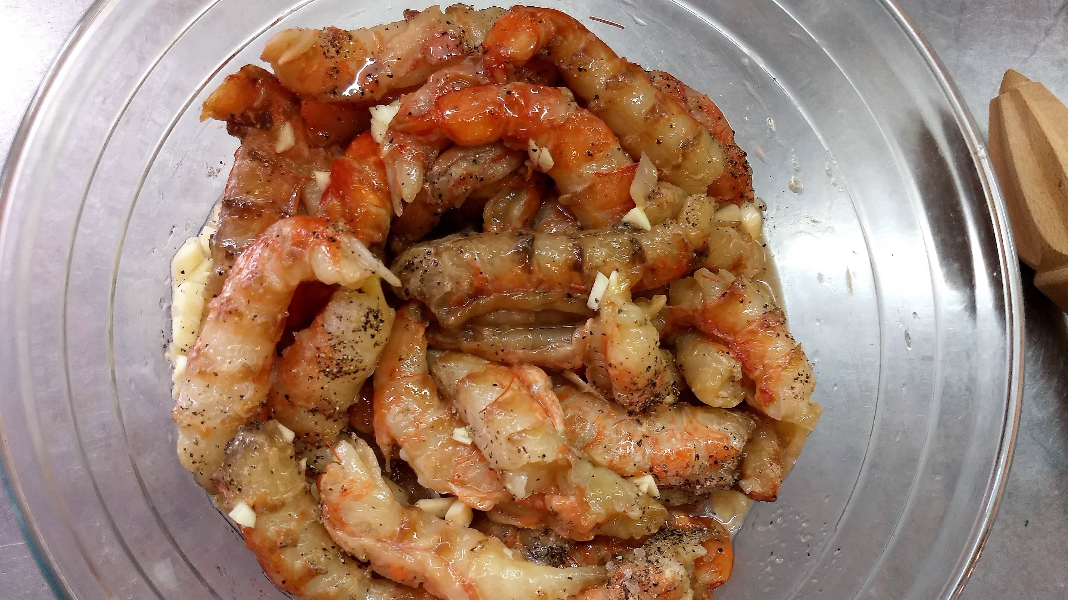- En un bol colocar los langostinos y condimentarlos con sal, pimienta, ajo y el jugo de lima. Reservar