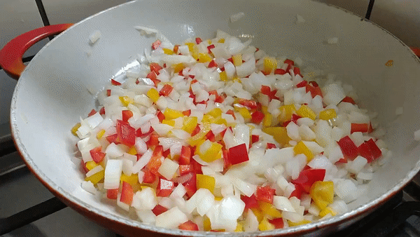 - Una vez que está caliente hacer un sofrito con las cebollas y morrones