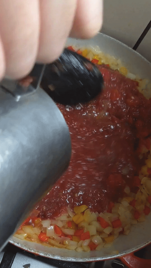 - Cuando las cebollas estén bastante transparentes sumar el tomate en cubos o triturado (en este caso decidimos triturarlo porque estaban bastante duros)