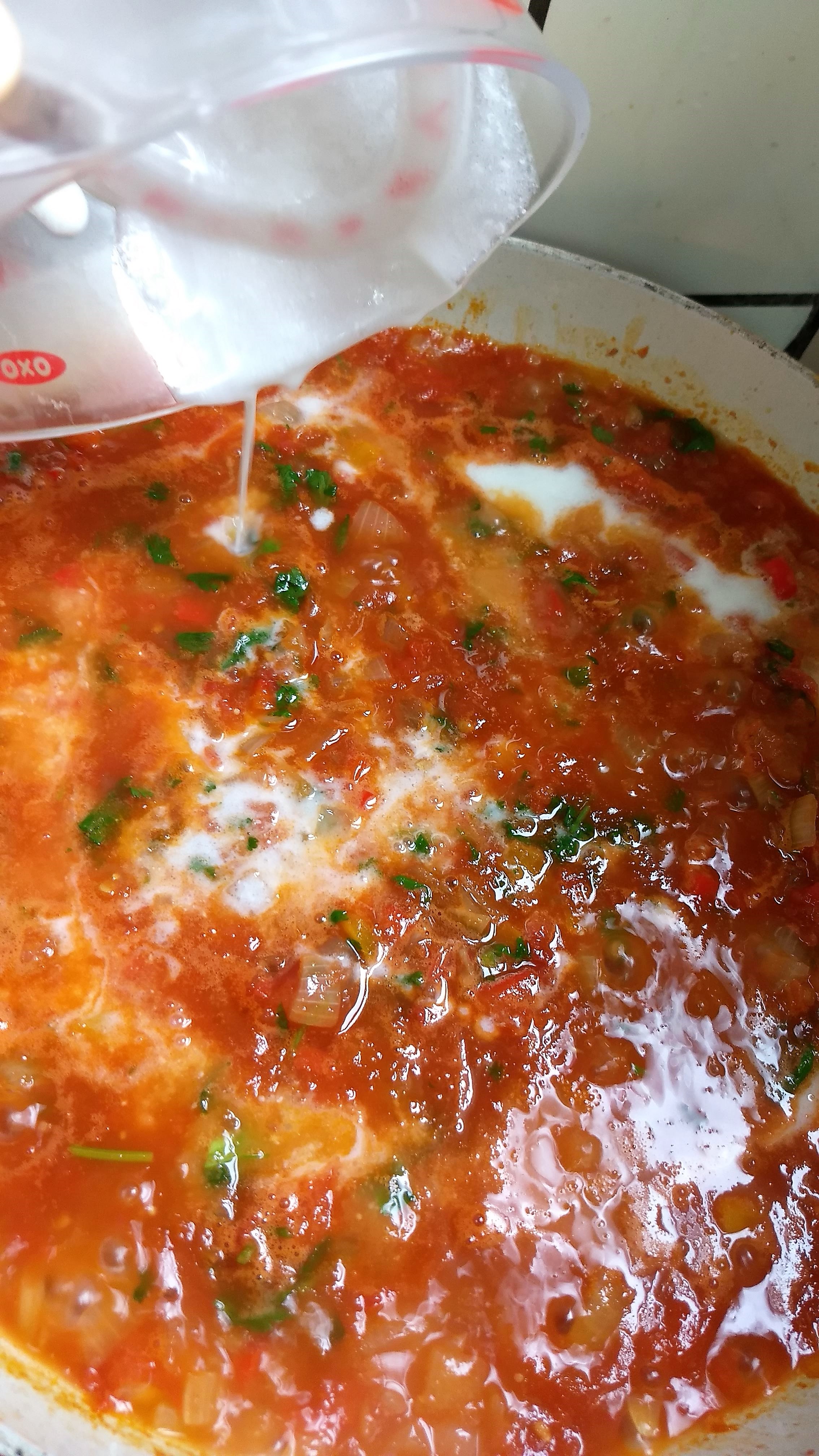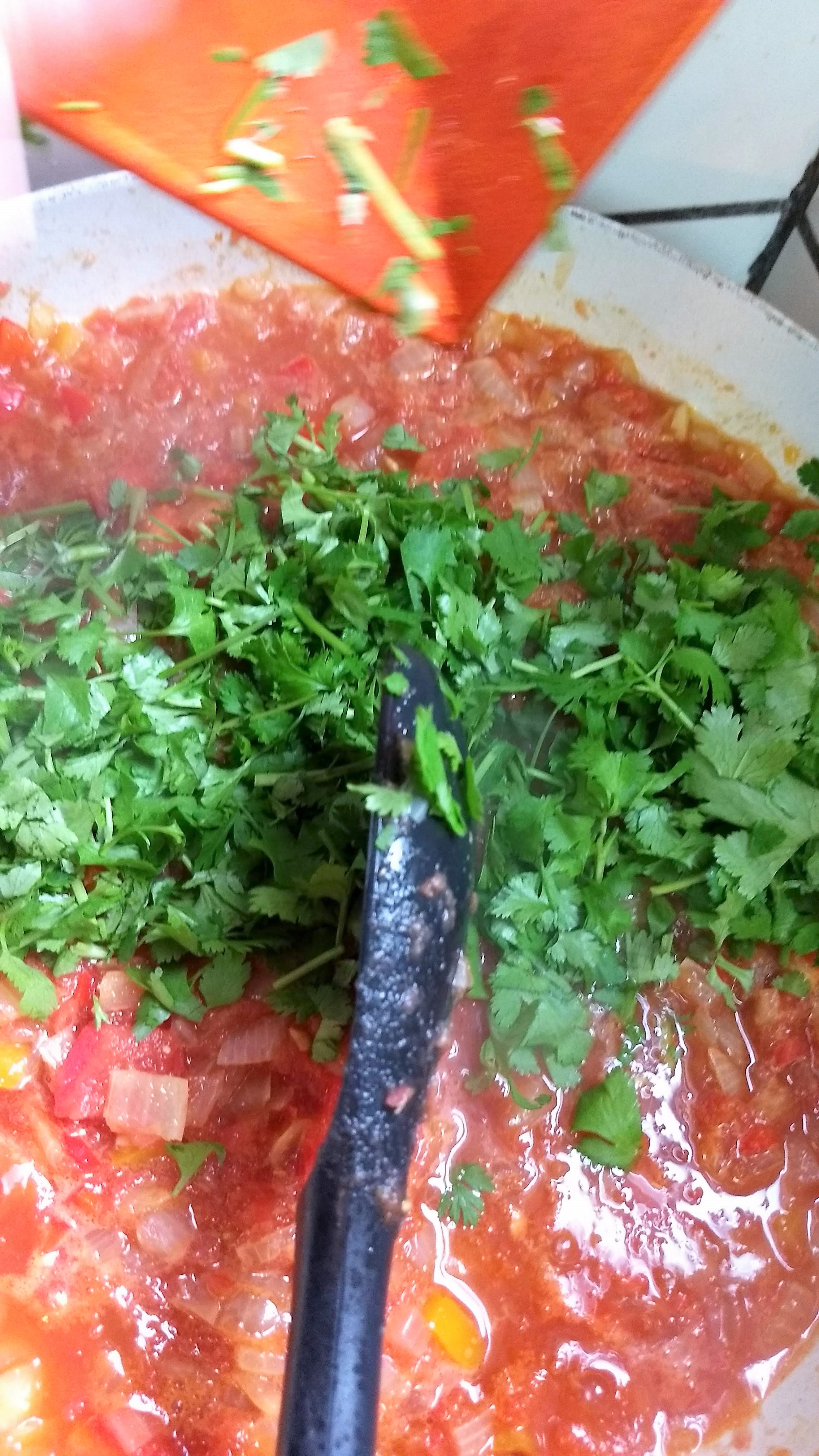 - Agregar el pimentón, cilantro y leche de coco y mezclar