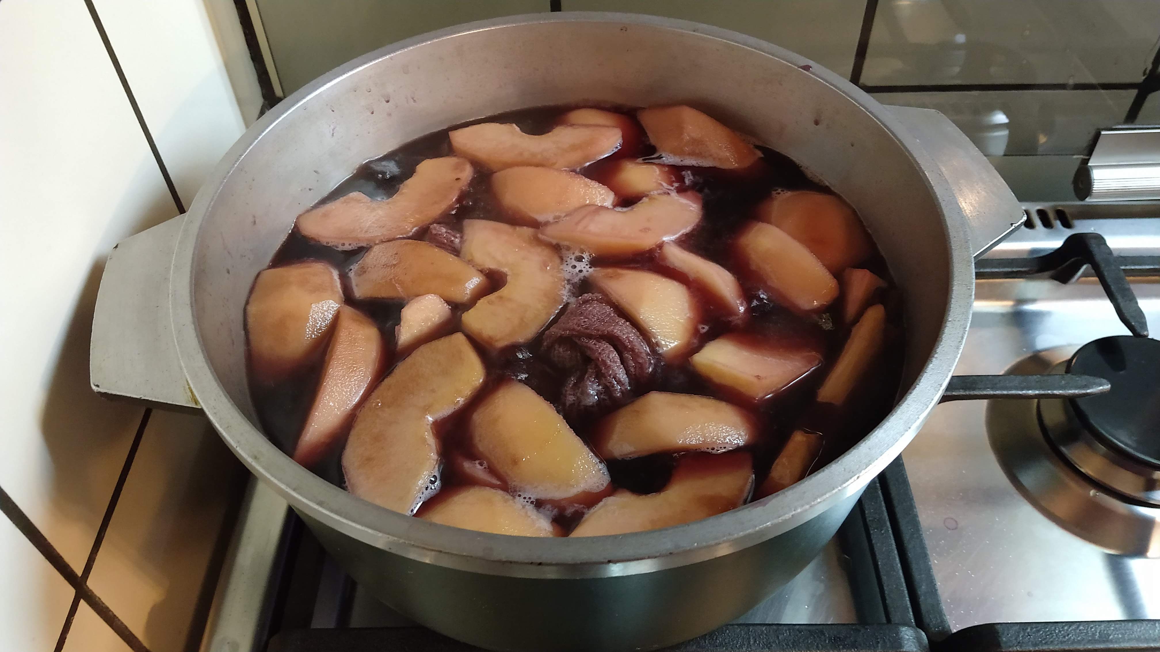 - Cuando están todos listos, apagar el fuego y dejar enfriar con todos los trozos de membrillo en el líquido de cocción. Idealmente, dejarlos toda la noche en la heladera para que el vino especiado se impregne bien