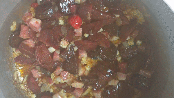 - Una vez dorados sumar el chorizo colorado y la morcilla, cocinar unos 4 min a fuego medio