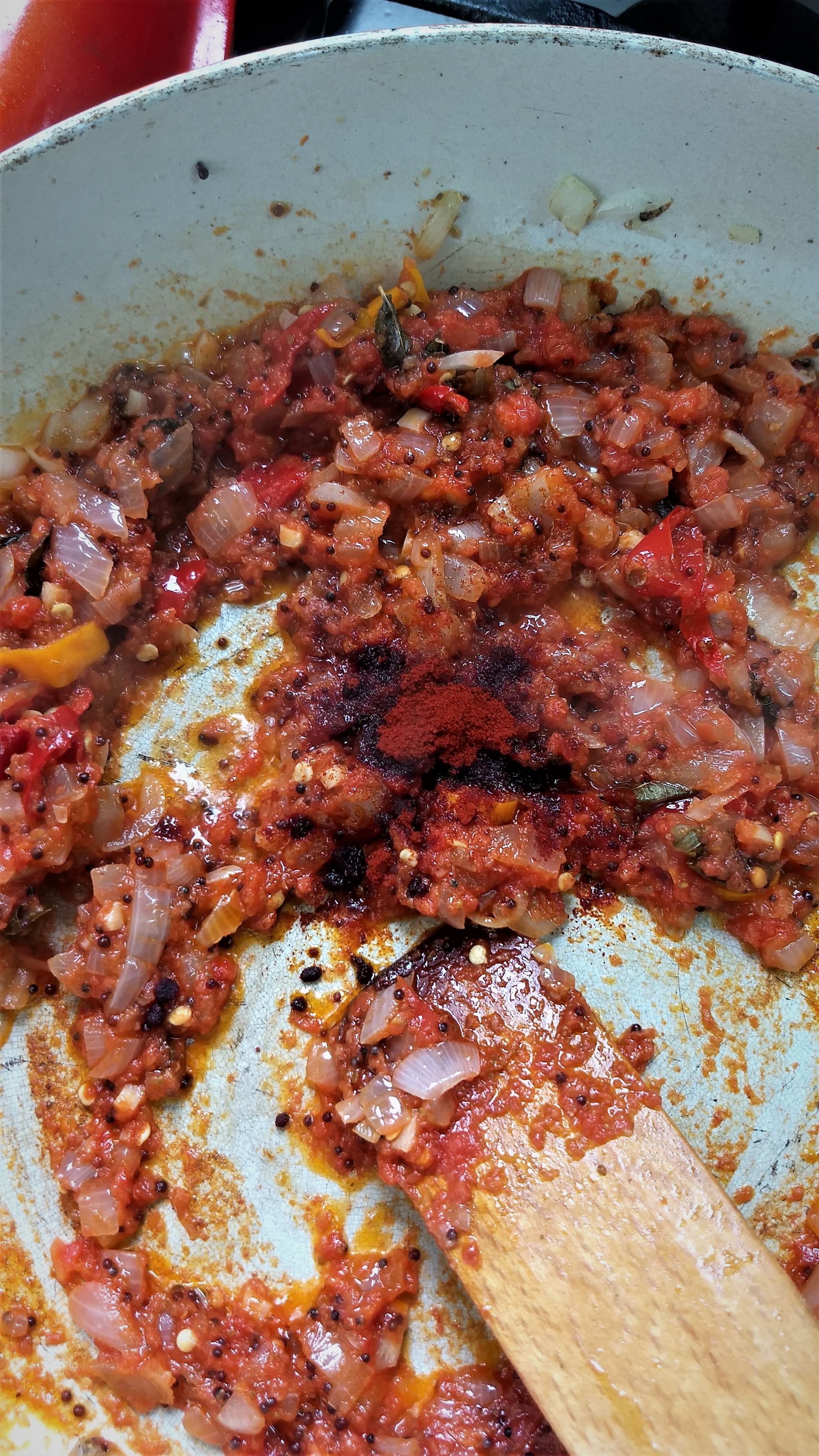 - Si es necesario poner un poco más de aceite, dejar que caliente y sobre ese aceite colocar el coriandro y comino. Dejar por unos 30 seg hasta que liberen su aroma y mezclar