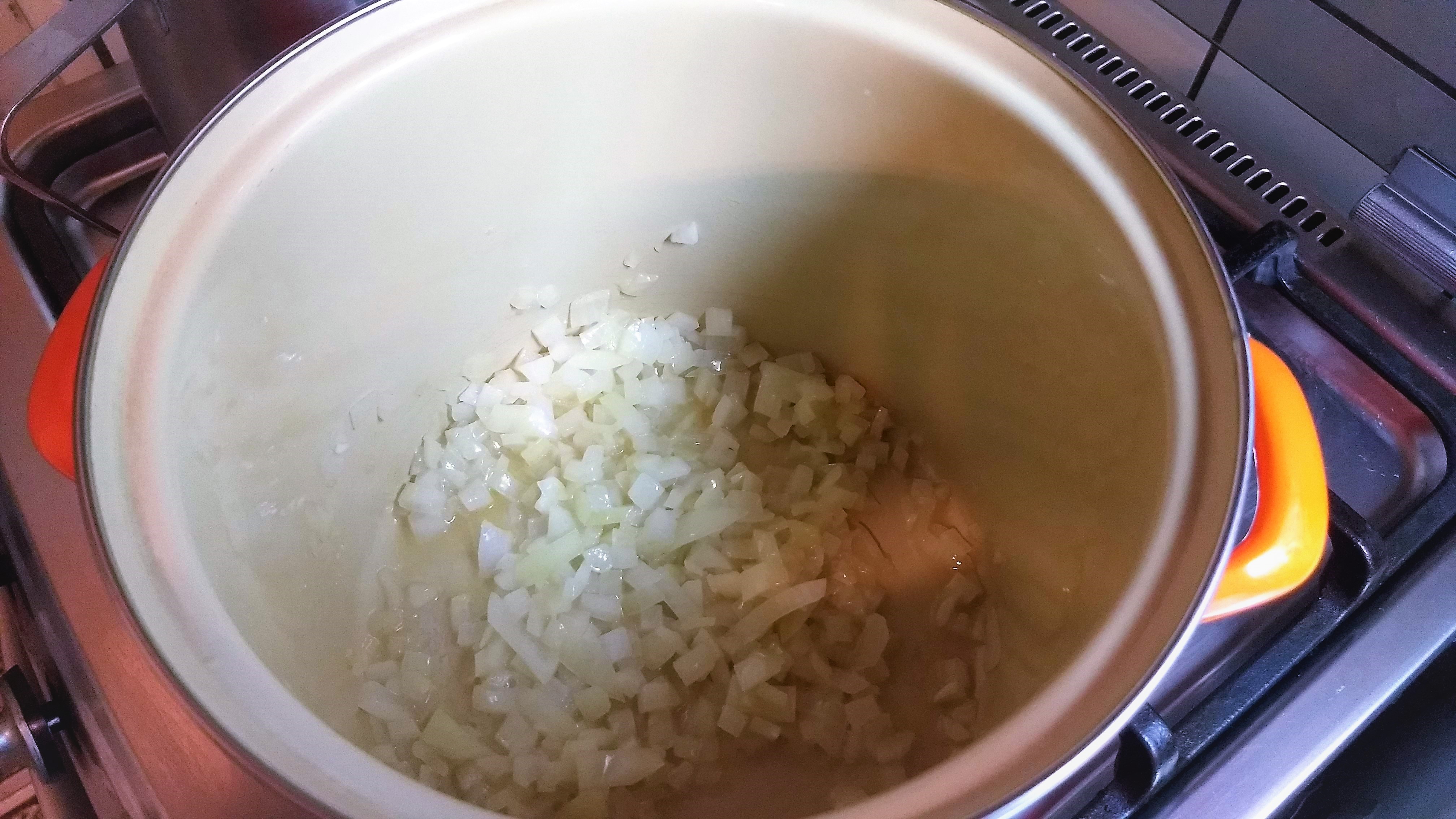 - Sumar la cebolla y cocinar a fuego medio hasta que se transparente sin dorar