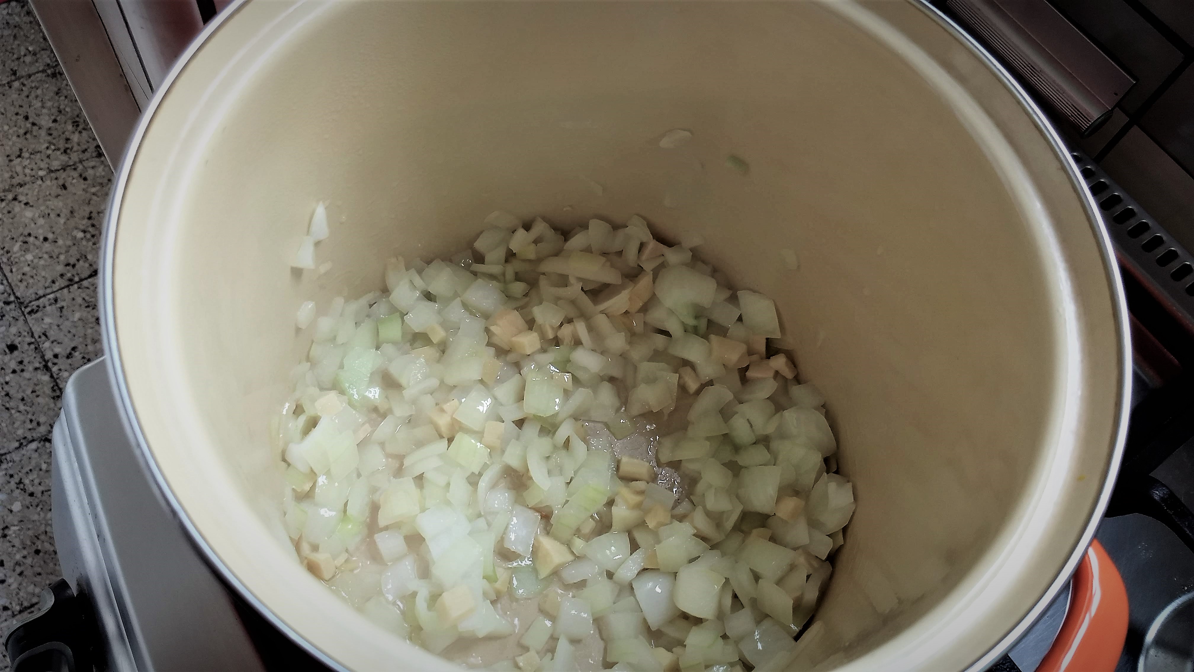 - Cuando las cebollas están listas sumar el jengibre y cocinar menos de 1 min