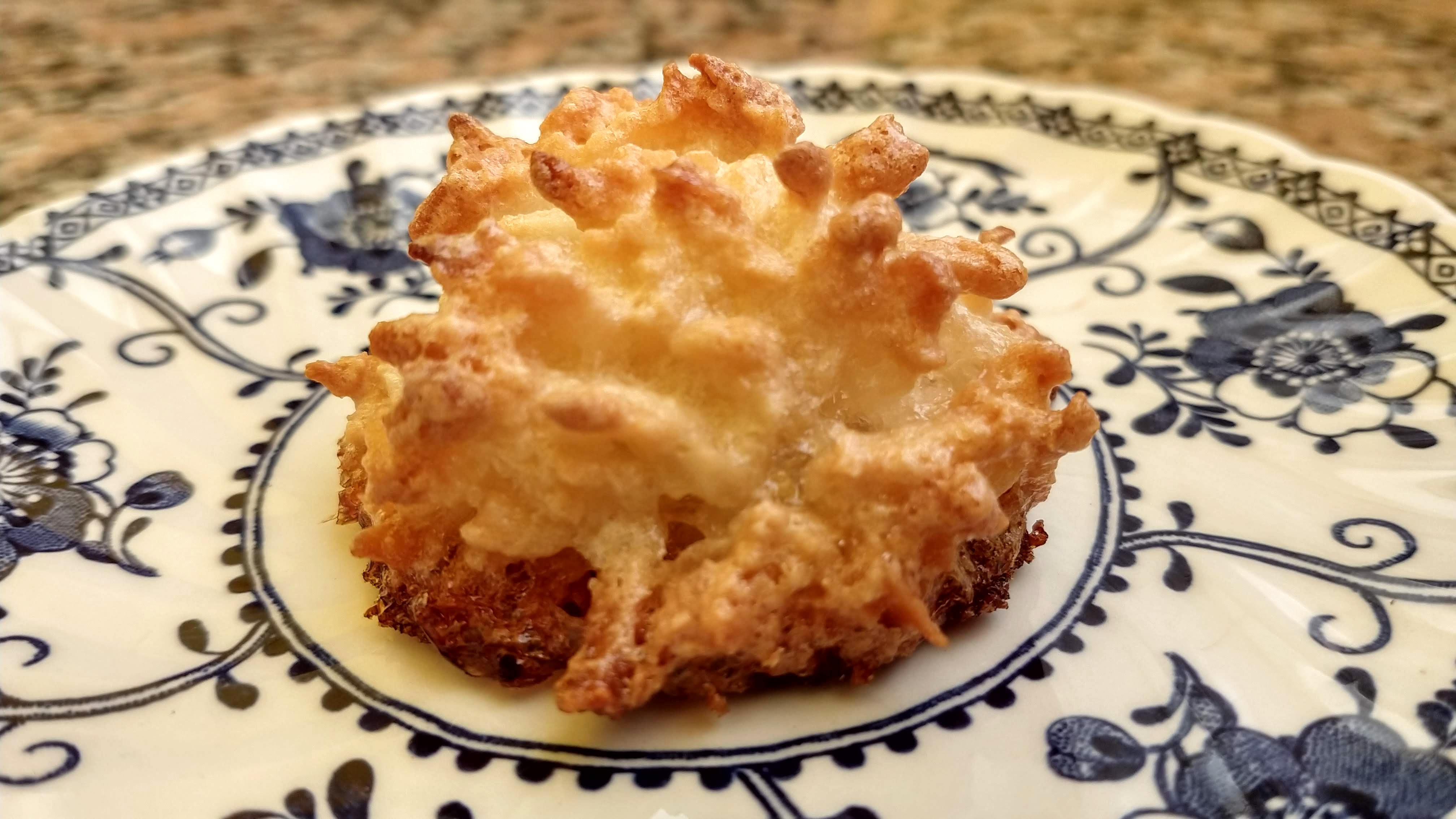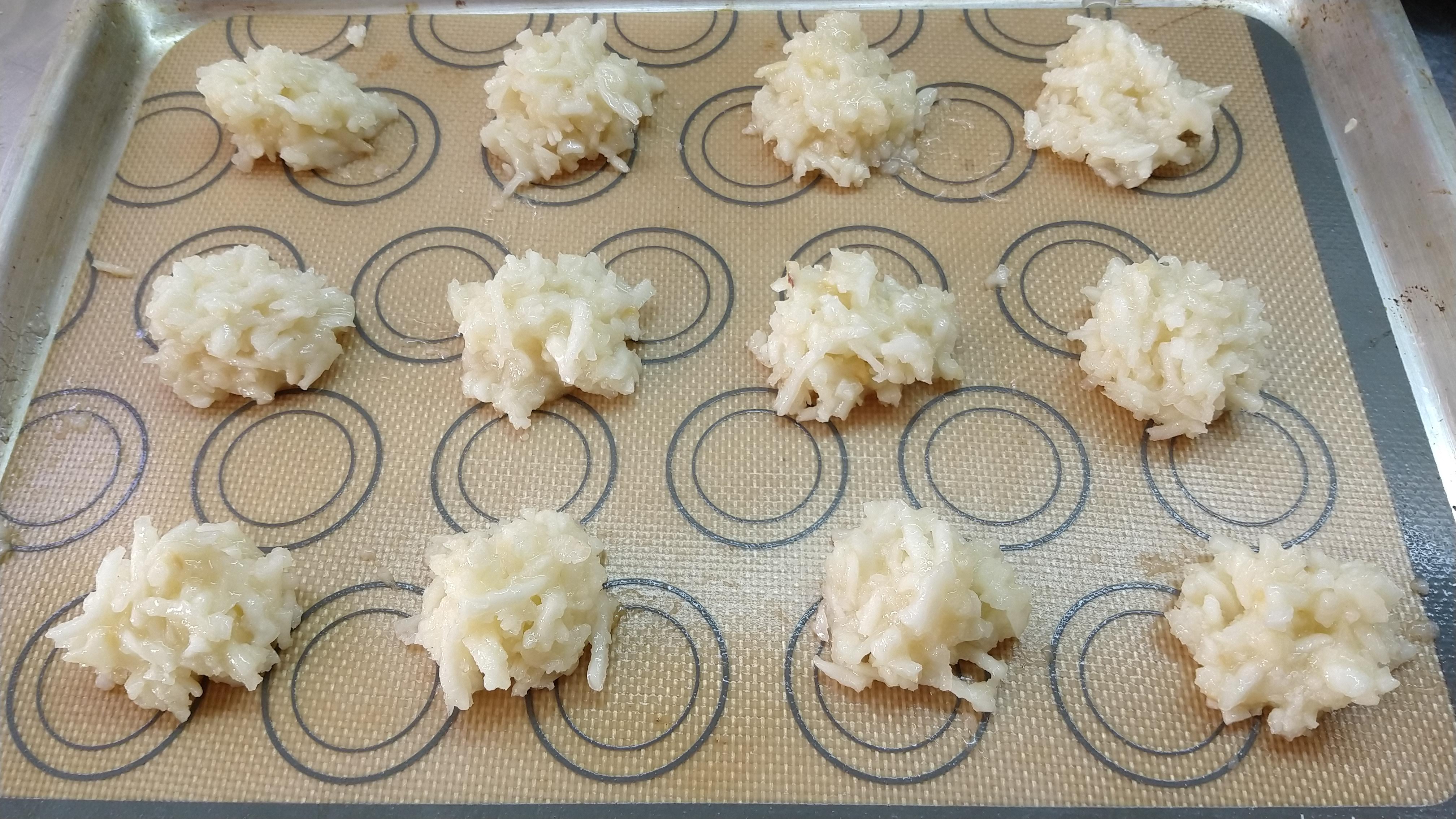 - Sobre una placa con papel manteca o mat de siliconas, aplicar con una cuchara o manga (esta última, sólo si el coco está rallado lo suficientemente fino, lo que no fue el caso en estas fotos), dejando espacio porque crecen en volumen
