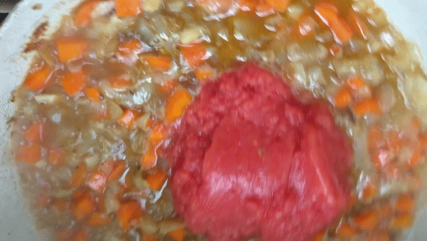 - Cocinar unos pocos minutos y sumar el tomate triturado. Mezclar