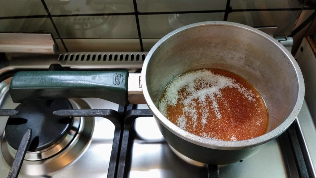- Poner a fuego BAJO y NO REVOLVER en ningún momento. El caramelo se hará por la cocción del azúcar, tomando un color ámbar. Si el color es oscuro es que se está quemando, lo que de dará un sabor amargo y habrá que tirarlo.