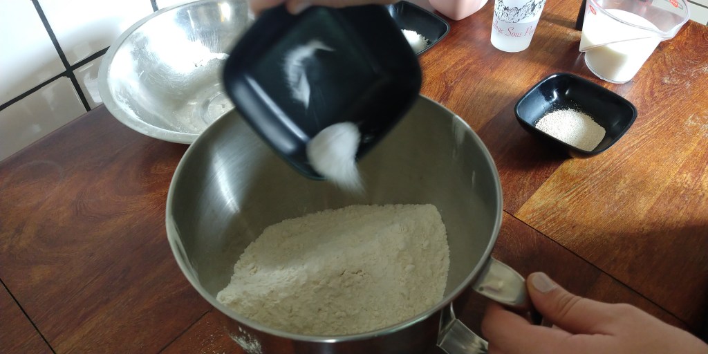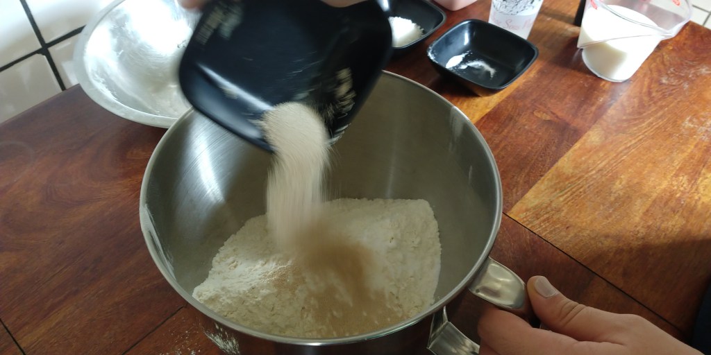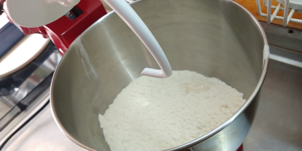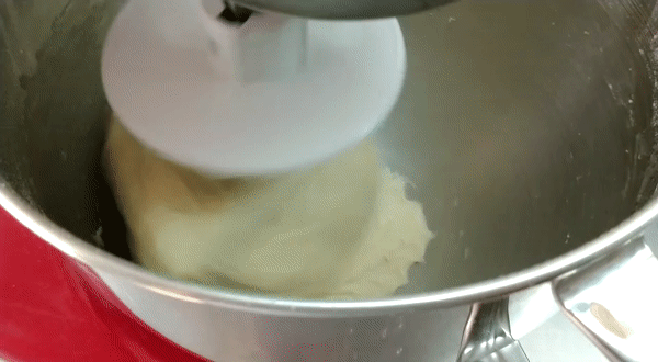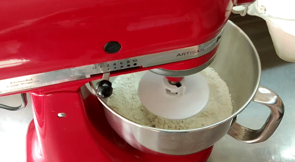 - Colocar la mezcla seca en una batidora con gancho de amasar o en una multiprocesadora en función amasar