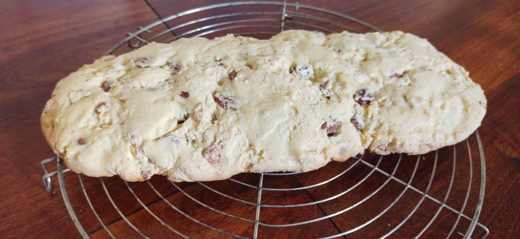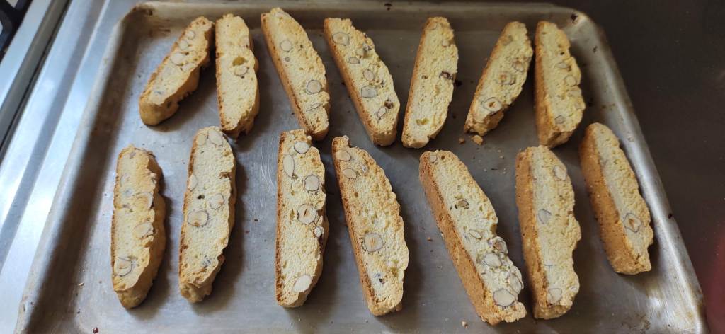 - Con la masa aún tibia-caliente, cortar los biscotti usando un cuchillo de sierra, en tiras de un grosor aproximado de 1,5 cm
