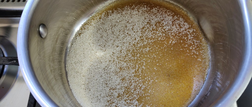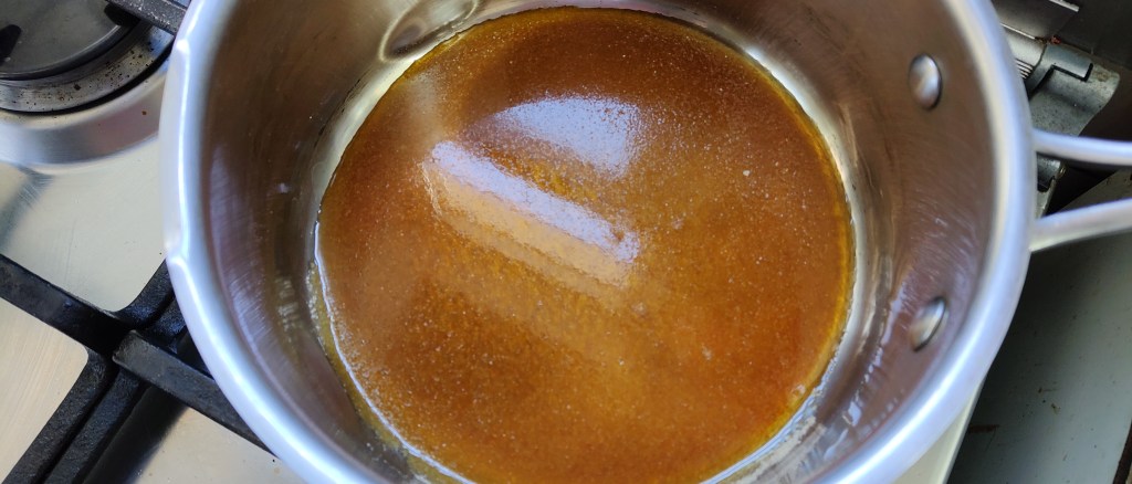 - En una olla chica poner la mitad del azúcar (75 gr) bien esparcida en el fondo, a fuego muy bajo (un difusor es aconsejable). NO TOCAR NI REVOLVER en ningún momento.