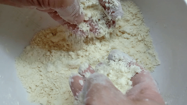 - Agregar la manteca salada y mezclar todo con la punta de los dedos para que quede como arena