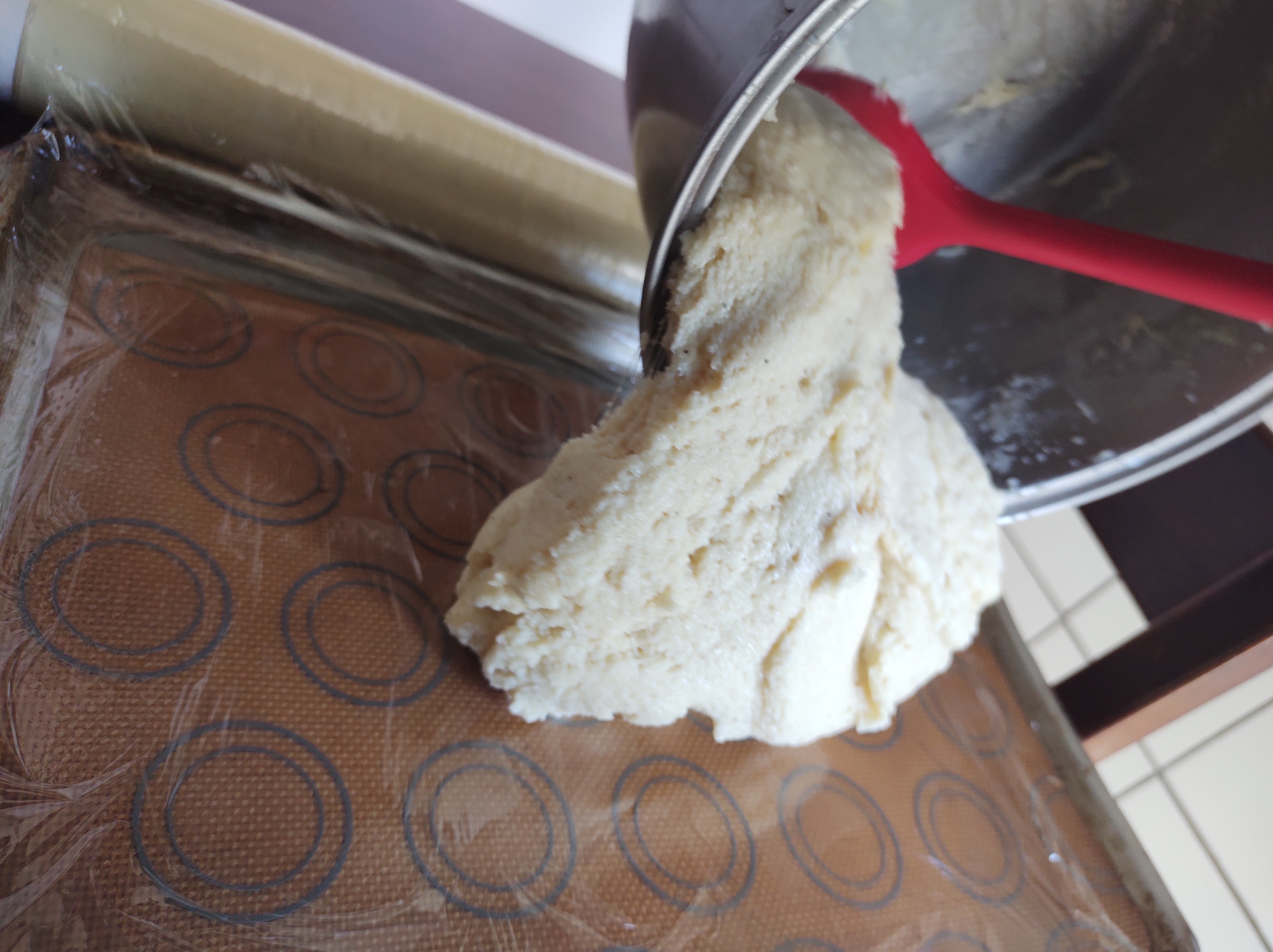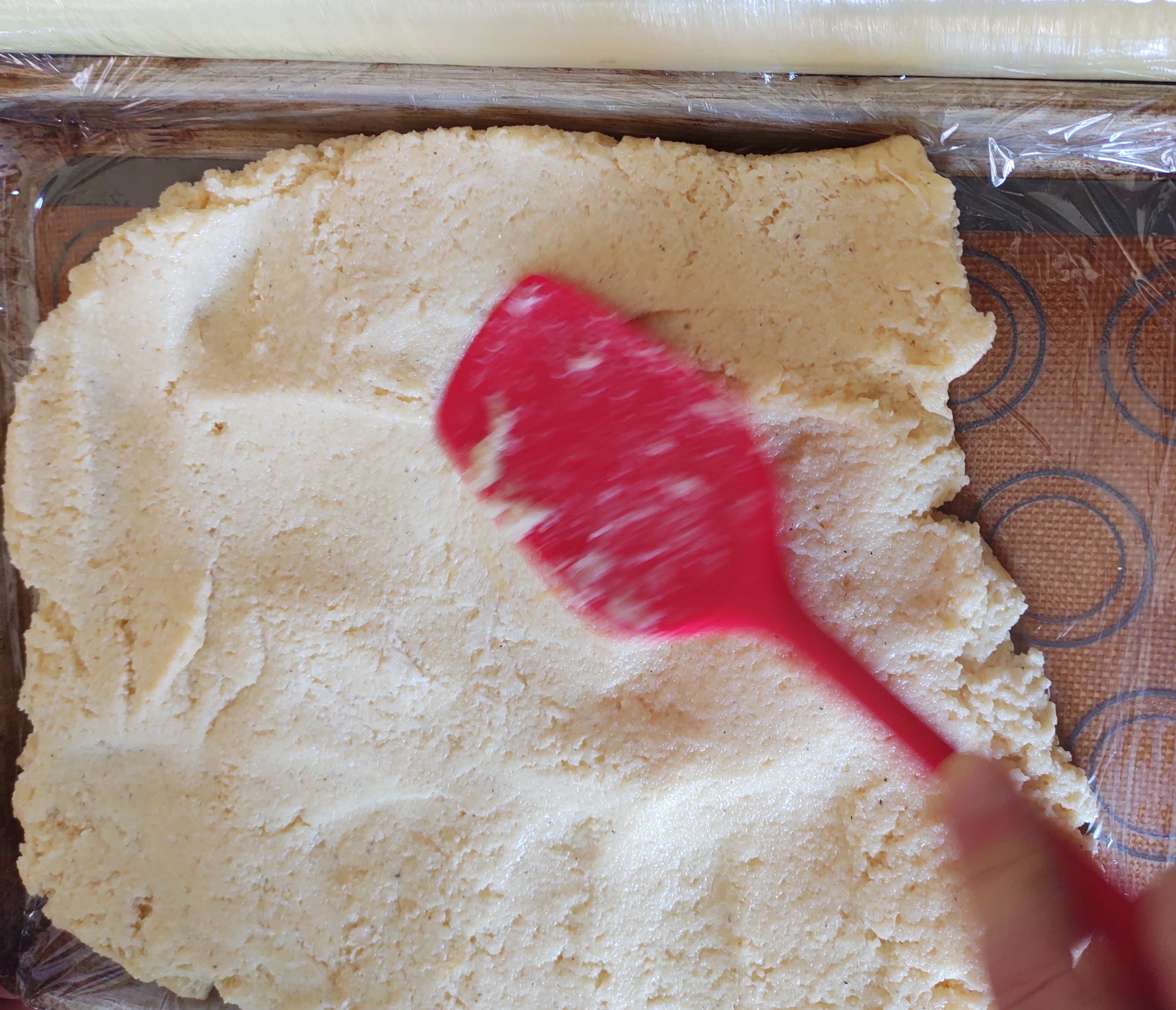 - Sobre una bandeja o superficie plana, estirar el preparado en forma uniforme, con el espesor definitivo (1,5 a 2 cm aprox.). Recubrir con film y enfriar en heladera por al menos 1 hora.