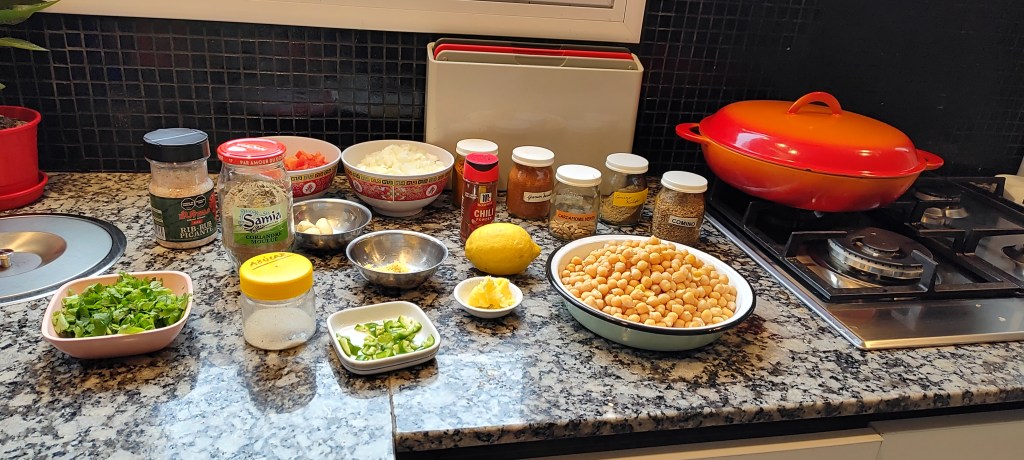 - Garbanzos secos 400g (remojados toda una noche, enjuagados y hervidos) o 2 latas de 400g escurridos