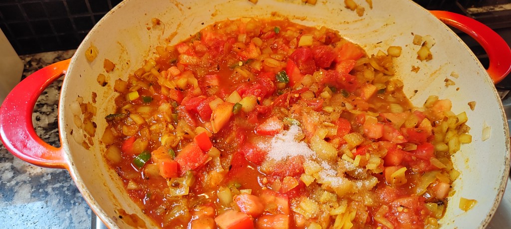 - Una vez que las cebollas estén translúcidas, alrededor de 7-8 minutos, añadir el tomate, la salsa de tomate y el azúcar, removiendo regularmente. Reducir hasta que esté espeso y se separe de los bordes de la sartén, alrededor de 8 minutos